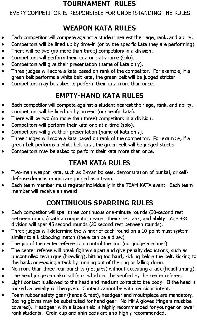These twelve rules help provide a fair, fun, and safe tournament for every competitor. Please read, study, and understand these rules before competing.